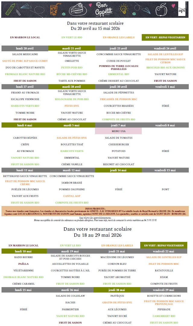 Menus pour la période du 20 avril au 29 mai 2026